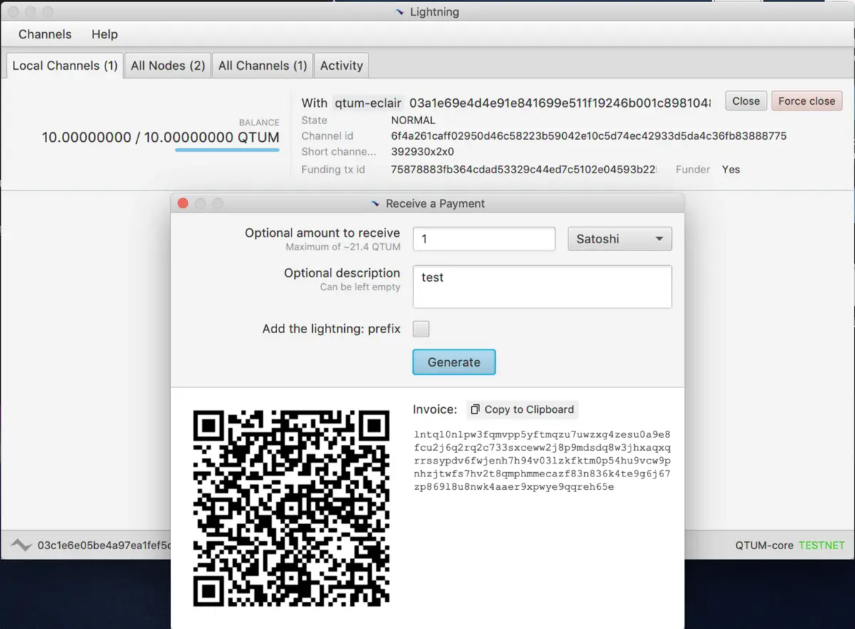 点击左上角的 "Channel" 按钮,选择 “Reveive Payment”, 在弹出的页面中填写收款金额,点击 “Generate” 按钮,得到自己的收款地址。这里我们选择了一个非常小的金额 1 Satoshi,相当于 0.00000001 个QTUM,如此小金额的转账,在不使用闪电网络的情况下是难以想象的。
