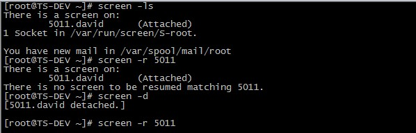 [root@TS-DEV ~]# screen vi /tmp/david.txt之后我们想暂时退出做点别的事情,比如出去散散步,那么在screen窗口键入C-a d,Screen会给出detached提示: