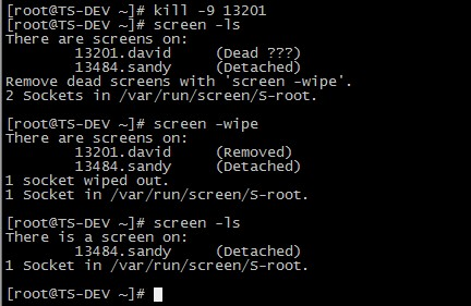 如果由于某种原因其中一个会话死掉了(例如人为杀掉该会话),这时screen -list会显示该会话为dead状态。使用screen -wipe命令清除该会话: