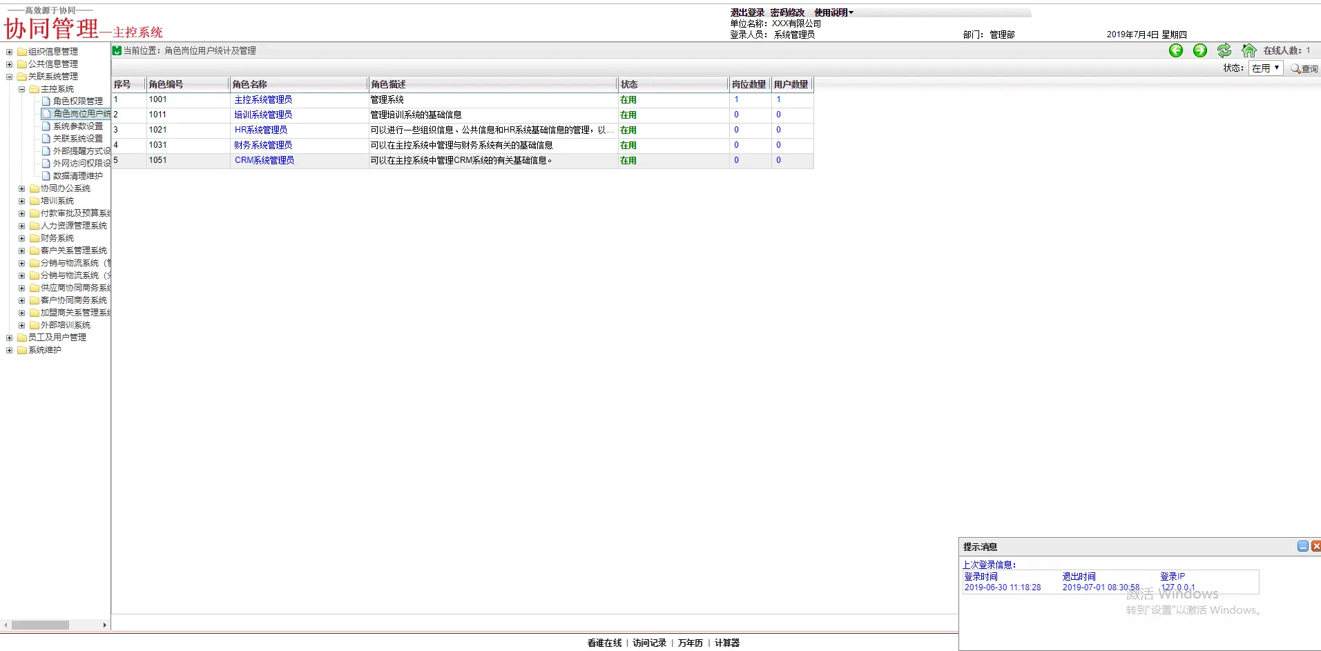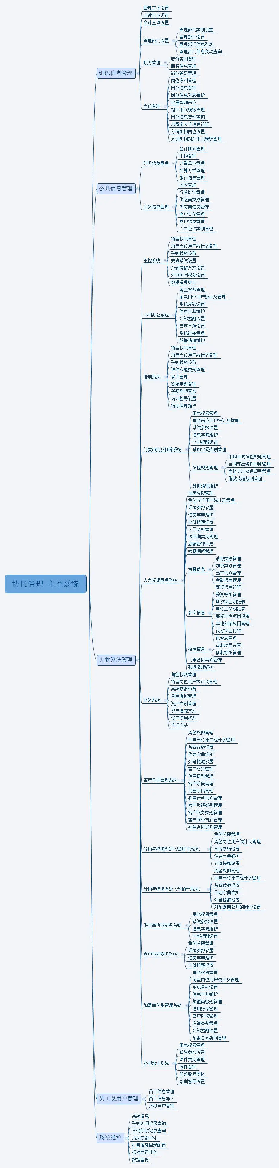 产品功能:组织机构管理、职务管理、岗位管理、财务管理、业务管理、各个子系统的角色权限设置、系统配置等,已经正式发布的产品包括了OA系统、TC系统、PB系统、HR系统、FM系统、CRM系统、DL系统,以及用于基础信息管理的主控系统。