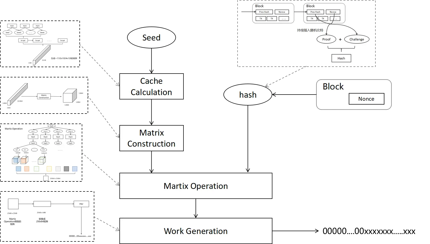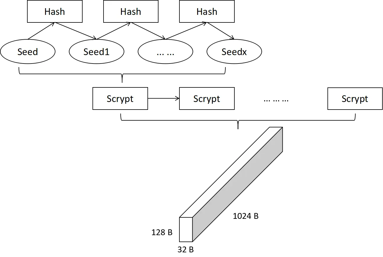 这个步骤主要使用种子通过一定的变换获得一个矩阵。我们首先通过一定次数的哈希将种子进行扩展,以满足Scrypt的输入要求,然后使用Scrypt函数生成一个32x1024x128的矩阵。值得注意的是,我们使用的Scrypt算法就是使用在莱特币中的算法。