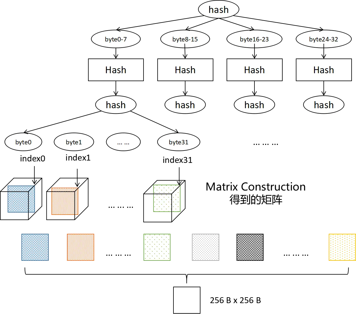 该步骤比较复杂,也是最有意思的步骤。采集的区块头哈希分割为四份,每份做一次哈希生成一个新的哈希值,新的哈希值的每一个比特作为Matrix Construction生成矩阵切片的索引值,从而切片获得一个矩形。经过上述步骤后将获得128个矩形,对这些矩形进行矩阵相乘最后得到一个矩阵。
