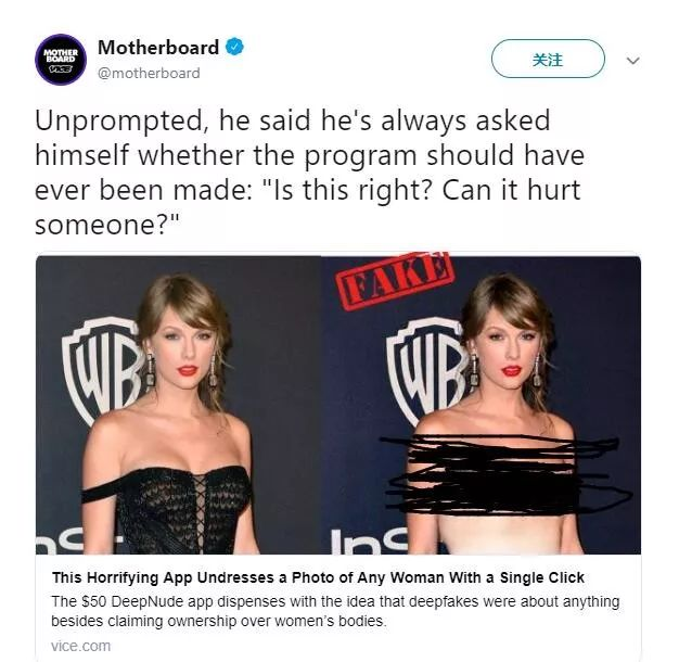 Motherboard使用DeepNude测试了Taylor Swift、Natalie Portman等女星的照片,无一例外都成功了。