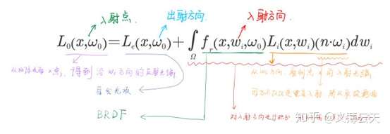 渲染方程中,x为当前的物体,L(x,w) 表示,在x处,沿着w方向射出的光照强度,Le为自发光,后半部分是反射光。方程里面的坐标表示都是球坐标。,球坐标的解释如下,具体的计算和推导细节请读者参考其他资料。
