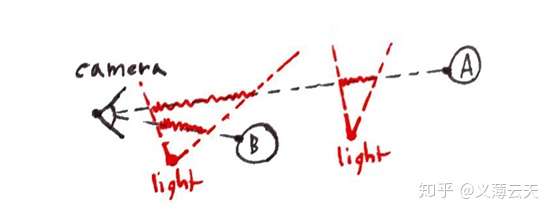当物体在光线的阴影里面的时候需要进行相交判断,具体做法是从当前位置向光源发射一束光线,如果没有碰撞说明没有遮挡,这里又个需要注意的地方,有可能会导致光源前后都形成遮挡区域这时候要根据碰撞距离来保留合适的那一个。