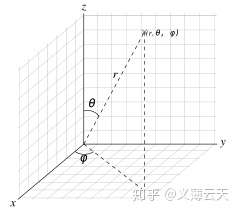物理学中通常使用的球坐标(r, θ, φ)(ISO 约定):径向距离 r,极角θ (theta) 与方位角φ (phi)。在数学里,球坐标系(spherical coordinate system)是一种利用球坐标表示一个点P在三维空间的位置的三维正交坐标系。右图显示了球坐标的几何意义:原点与点P之间的径向距离(radial distance),原点到点P的连线与正z-轴之间的极角(polar angle),以及原点到点P的连线在xy-平面的投影线,与正x-轴之间的方位角(azimuth angle)。它可以被视为极坐标系的三维版本。