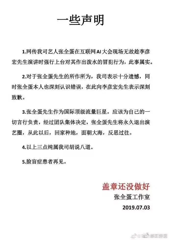 张全蛋工作室在事后一个小时以一张红头文件给出了警告