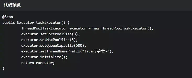 我们定义了最大的并发线程数为3,并且定义了队列中的最大任务数为500,线程名字的前缀为“Java同学会”,在log打印日志时,凡是线程池中的线程执行的,都会打印出“Java同学会”的线程名字。当然你还可以增加一些其他的设置。如果你不配置Executor这个Bean,Spring会自动创建SimpleAsyncTaskExecutor,并使用它来执行异步方法。