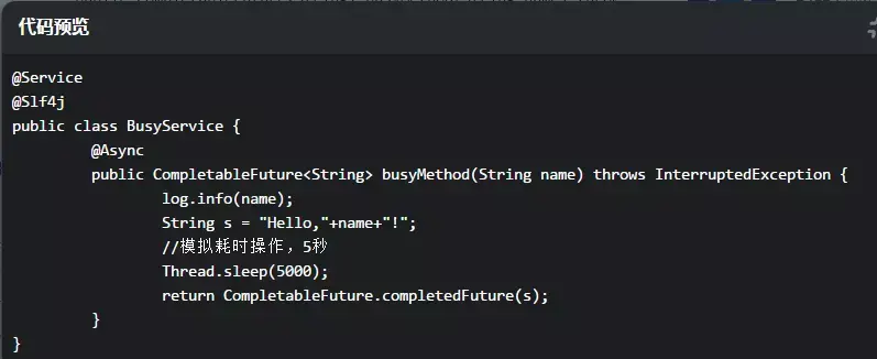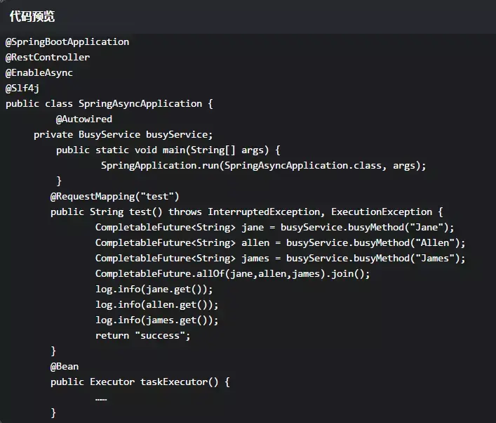 其中,BusyService上的注解@Service标识着它会被Spring初始化为一个实例,而@Slf4j则标识着我们可以直接使用log打印日志。然后我们再看看busyMethod方法,它的返回值是CompletableFuture,CompletableFuture继承自Future,它可以把多个异步执行的结果合并到一个单独的异步结果中,CompletableFuture是任何异步服务所需要的。我们再看看busyMethod方法上的注解@Async,这个注解是我们今天的主角,它标识着这个方法是异步方法,调用它时是异步调用的。再看看方法体中的内容,我们使用了线程休眠模拟那些耗时的服务,并返回CompletableFuture。