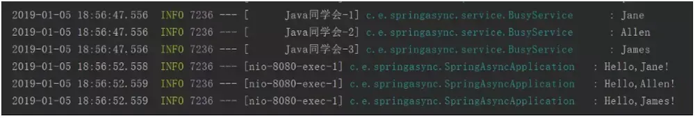 我们看到名字前缀为“Java同学会”前缀的3个线程,打印了busyMethod方法中的日志。因为busyMethod方法是我们定义的Executor线程池中的线程执行的。我们再看看test方法和busyMethod方法中日志打印的时间,它们相隔了5秒,说明test方法中的CompletableFuture.allOf(jane,allen,james).join()一直在等待,等待所有调用的异步方法都执行完,才继续执行。