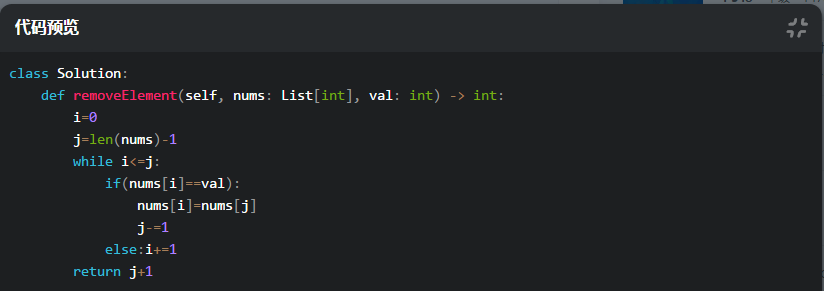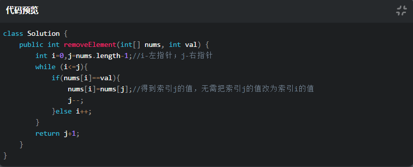只允许原数组修改,可以用双指针,左指针 i 自左向右,右指针 j 从右向左。如果索引 i 和 val 相等,则索引 i 得到索引 j 的值,并且 j 前移一位。如果不相等,i 后移一位。