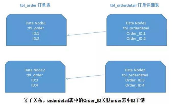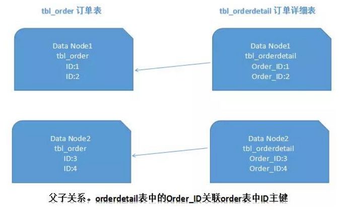 在关系型数据库中,表之间往往存在一些关联的关系。如果我们可以先确定好关联关系,并将那些存在关联关系的表记录存放在同一个分片上,那么就能很好的避免跨分片join问题。在一对多关系的情况下,我们通常会选择按照数据较多的那一方进行拆分。如下图所示: