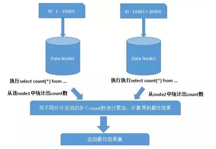 在使用Max、Min、Sum、Count之类的函数进行统计和计算的时候,需要先在每个分片数据源上执行相应的函数处理,然后再将各个结果集进行二次处理,最终再将处理结果返回。如下图所示: