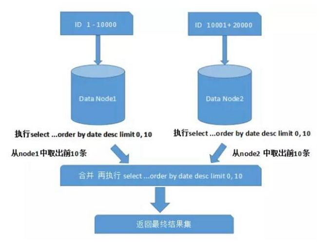 一般来讲,分页时需要按照指定字段进行排序。当排序字段就是分片字段的时候,我们通过分片规则可以比较容易定位到指定的分片,而当排序字段非分片字段的时候,情况就会变得比较复杂了。为了最终结果的准确性,我们需要在不同的分片节点中将数据进行排序并返回,并将不同分片返回的结果集进行汇总和再次排序,最后再返回给用户。如下图所示: