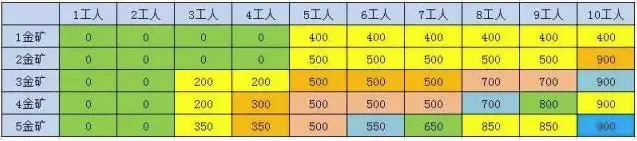 MAX[(4 金矿 10 工人的挖金数量),(4 金矿 5 工人的挖金数量 + 第 5 座金矿的挖金数量)]