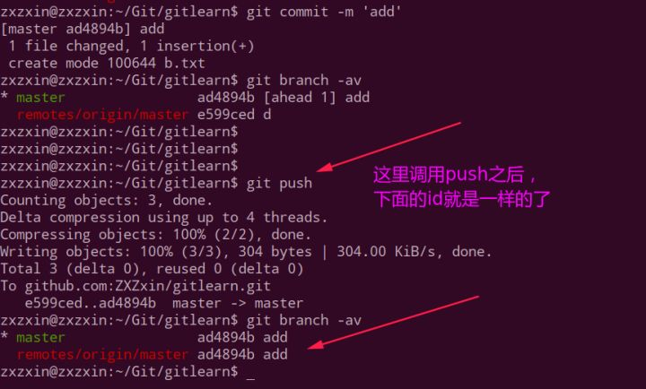 然后我们需要再调用一次git push来同步远程,这样id就会相同了。