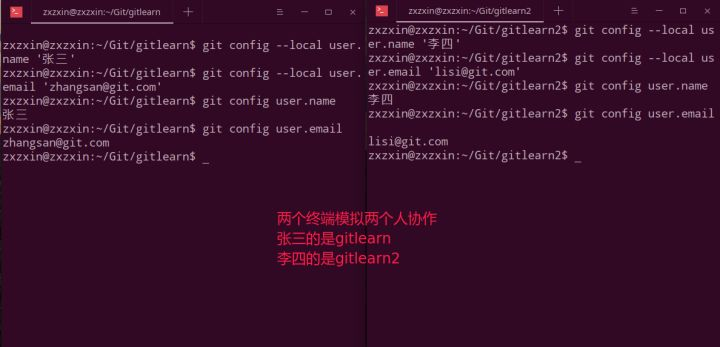 gitlearn和李四的gitlearn2都设置一下user.name和user.email;