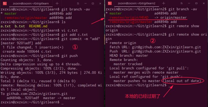 现在我们在gitlearn添加一个c.txt文件,然后git push到远程仓库,然后在gitlearn2这边输入git remote show origin来查看区别: