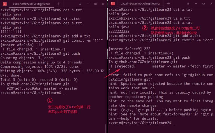 a.txt的第二行,然后也想push到远程,就会报错;