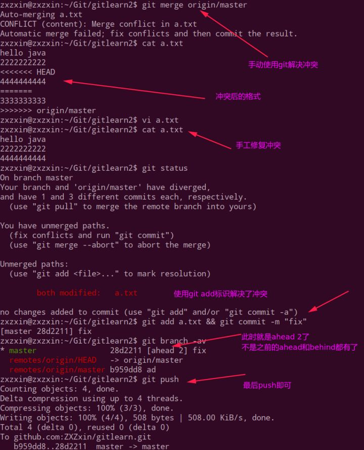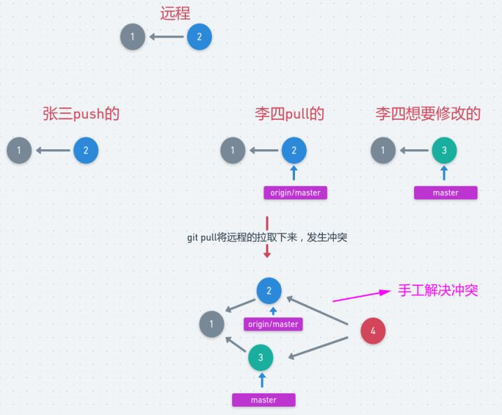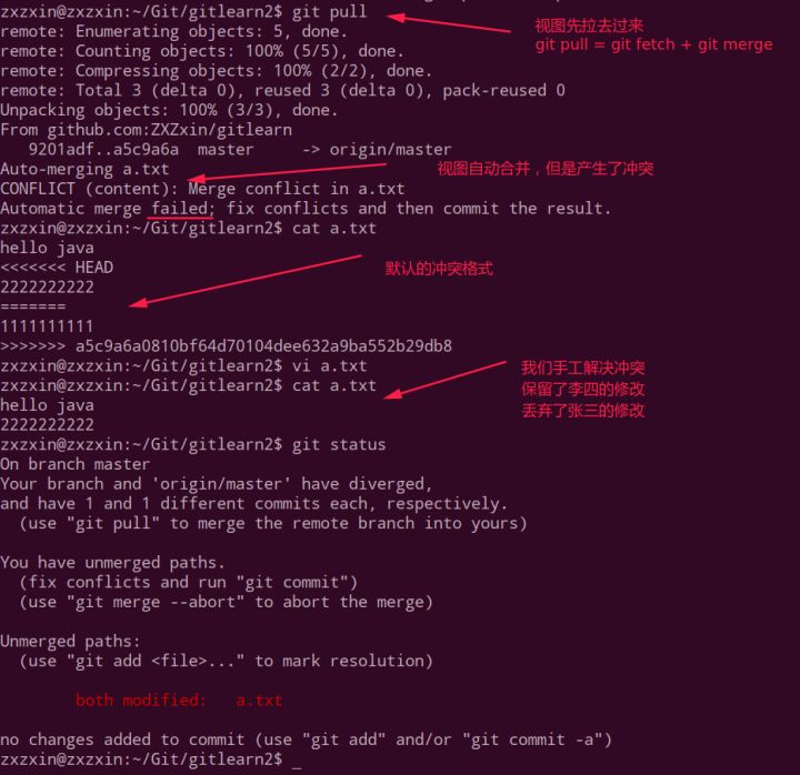 接下来我们在李四这边使用git merge手动解决冲突并push: