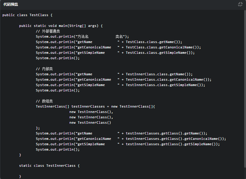 2、getSimpleName() 在获取普通类和内部类名的时候没区别,在获取数组类的时候有区别。