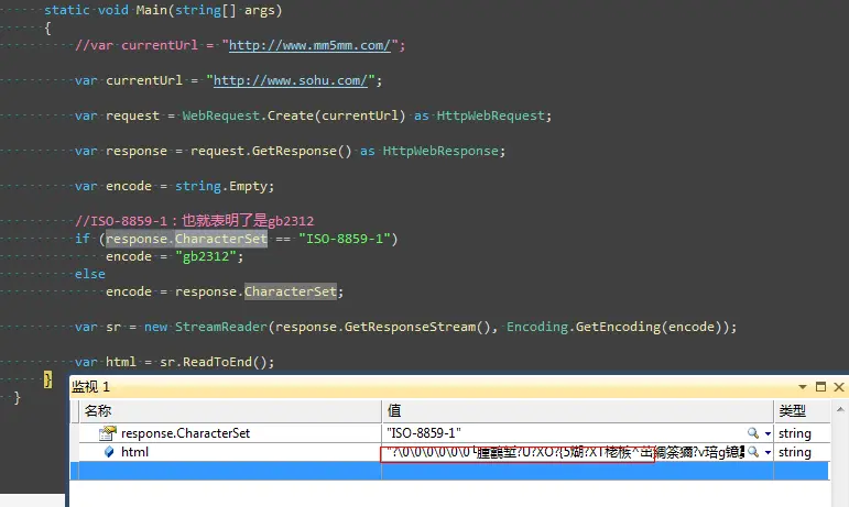 response.CharacterSet这个属性中同样也记录了编码方式,下面我们再来试试看。