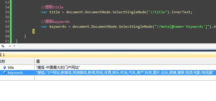 58 var keywords = document.DocumentNode.SelectSingleNode(//meta[@name='Keywords']).Attributes[content].Value;