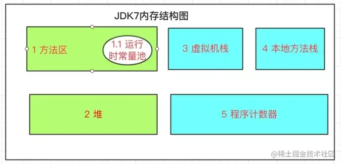内存共享(绿色):方法区(包含运行时常量池)、和堆。
