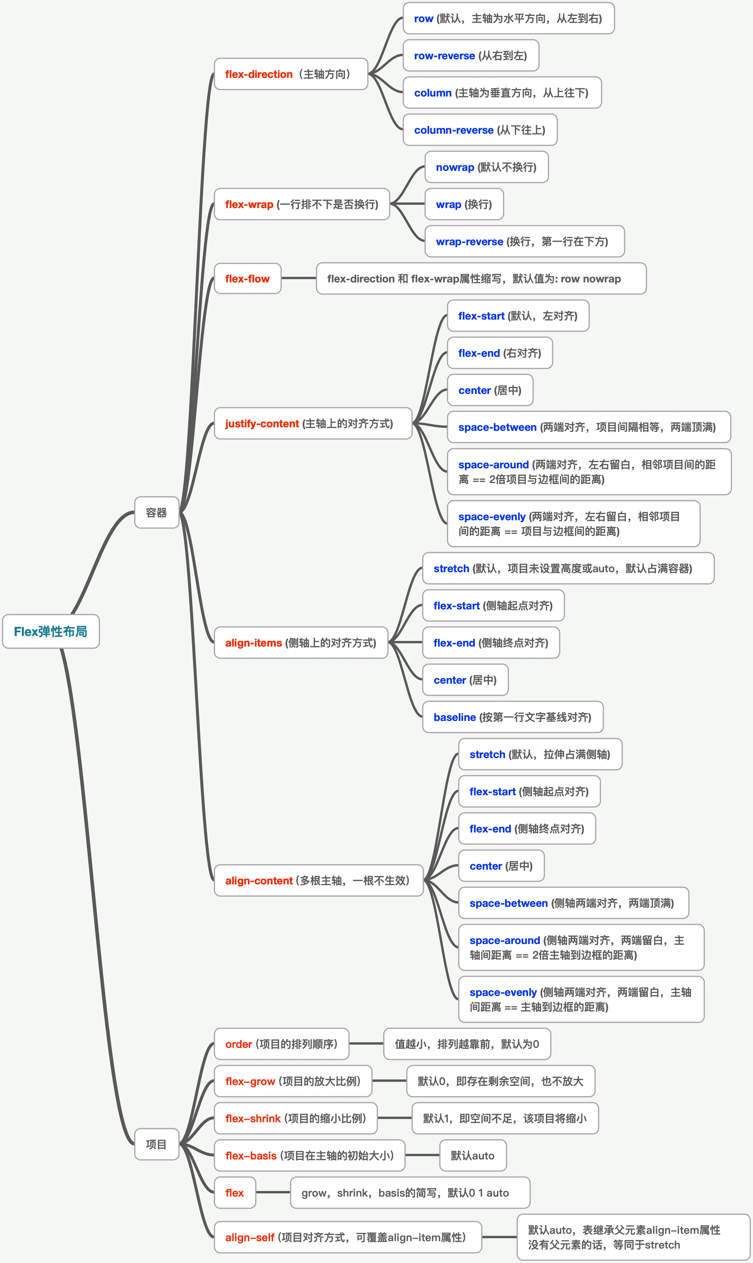 Flex的属性分为两个部分:「容器属性」和「项目属性」,具体如下图所示: