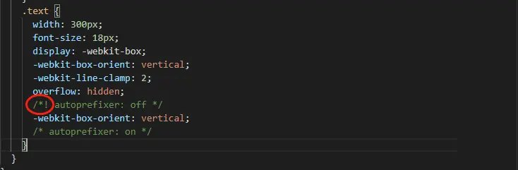 那么问题来了,有时候设置多行省略会失效,这个是为什么呢?原来是因为部分框架会在默认编译的时候过滤掉 " -webkit-box-orient: vertical; "这一句代码,所以就会出现你所看到的多行文本省略失效的问题。然而,这个问题该怎么去解决呢?其实很简单,只需要你加上两行注释,就能完美的解析你的全部代码。解决方法就是改变方式,关闭 autoprefixer 然后再开启:用注释就可以做到。