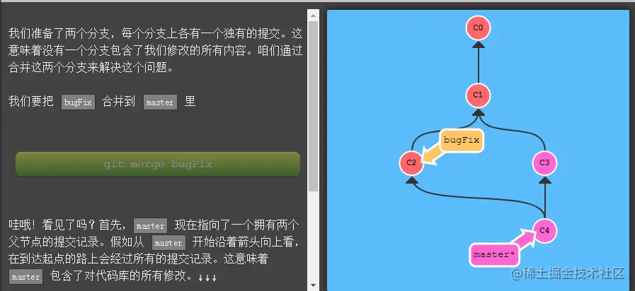 咱们先来看一下第一种方法 —— git merge。在 Git 中合并两个分支时会产生一个特殊的提交记录,它有两个父节点。翻译成自然语言相当于:“我要把这两个父节点本身及它们所有的祖先都包含进来。”