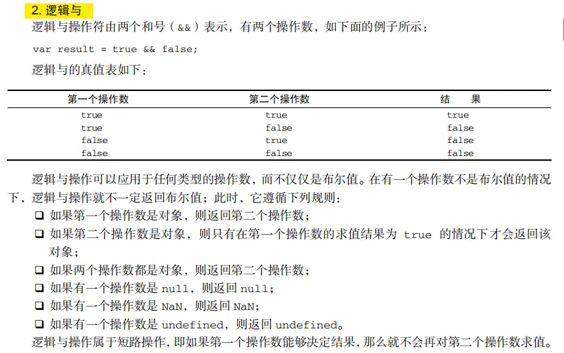 好了,现在我们知道 && 优先级高于...,所以先执行逻辑与操作,这里附上《JavaScript高级程序设计》一书对于逻辑与操作符的详细介绍: