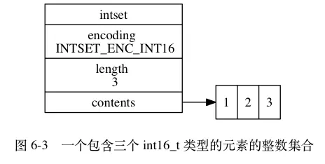 举个例子, 假设现在有一个 INTSET_ENC_INT16 编码的整数集合, 集合中包含三个 int16_t 类型的元素, 如图 6-3 所示。