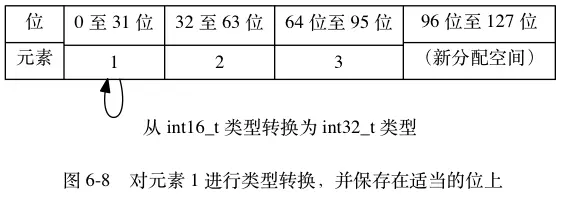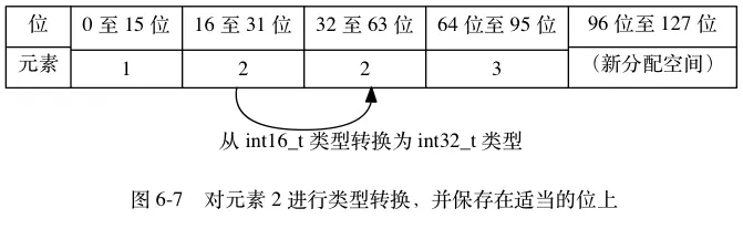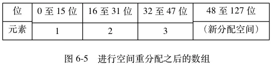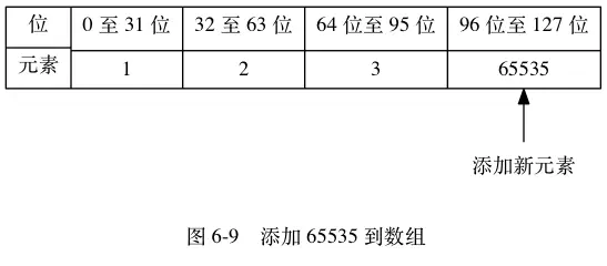 整数集合目前有三个元素, 再加上新元素 65535 , 整数集合需要分配四个元素的空间, 因为每个 int32_t 整数值需要占用 32 位空间, 所以在空间重分配之后, 底层数组的大小将是 32 * 4 = 128 位, 如图 6-5 所示。