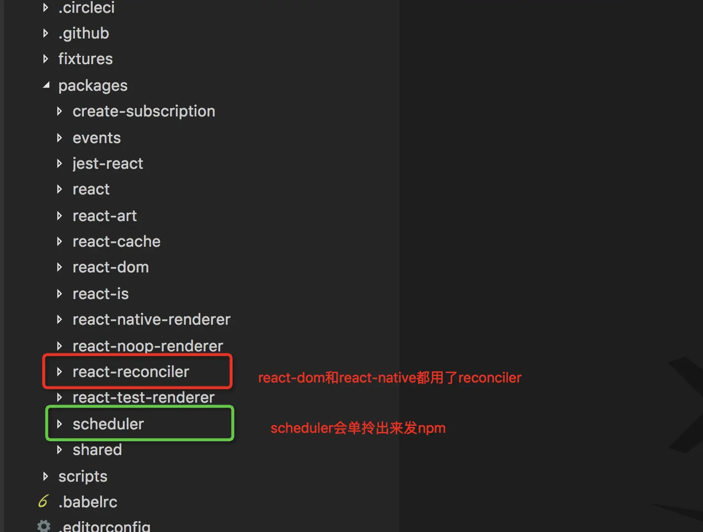 我们主要学习的部分是 react和react-dom。看看react的文件;其index.js就是引入了src/react;而src/React里的代码不超过100行。react本身源码是非常少的,但是react和react-dom代码加起来 压缩以后都有将近100k;所以大部分代码量在react-dom上;react本身是一个定义节点以及表现行为的包,具体dom如何渲染,更新,都是和平台相关的,在react-dom和react-native里不一样,所以这部分代码都是放在平台相关的逻辑里面。