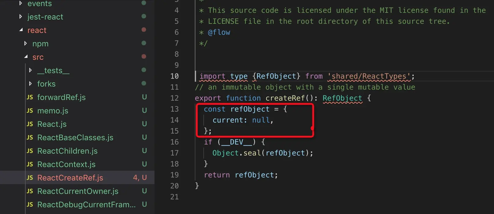 这三个方法,只有createRef是原生的,在源码里如下图所示:创建了{ current: null },并return出来 ;这里我们保留一个疑问?创建的ref如何挂载,后期我们继续看。