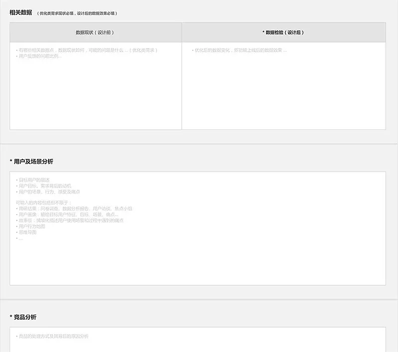 在网易邮箱大师设计团队内部中,为了避免设计师反复出现类似的问题,设计组会要求一些流程结果的可视化输出。如:我们将设计分析的常用方法整理形成模板,并要求设计师在拿到需求后,需要先完成这样一份简短设计分析报告(报告只需要包含关键性结果,不需要详细描述每个过程,因为这样反而会花费设计师大量时间在文档编辑上)。