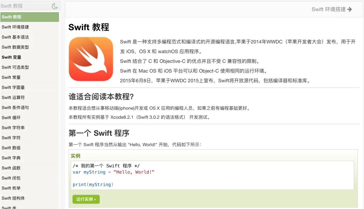 菜鸟教程:覆盖面也是非常可以的 环境 - 基本语法 - 数据类型 - 变量 - 可选项 - 常量 - 字面量 - 运算符 - 条件语句 - 循环 - 字符串 - 字符 - 数组 - 字典 - 函数 - 闭包 - 枚举 - 结构体 - 类 - 属性 - 方法 - 下标脚本 - 继承 - 构造过程 - 析构过程 - 可选链 - 自动引用计数 - 类型转换 - 拓展 - 协议 - 泛型 - 访问控制