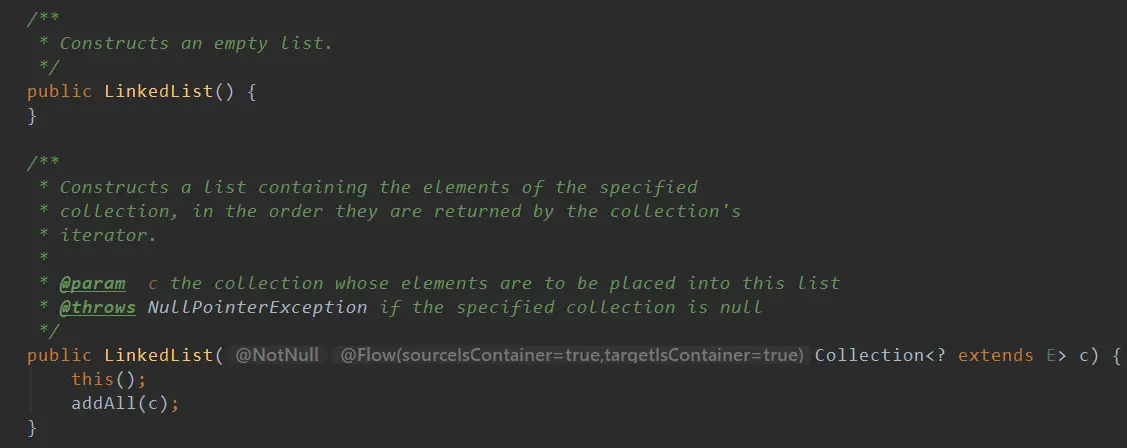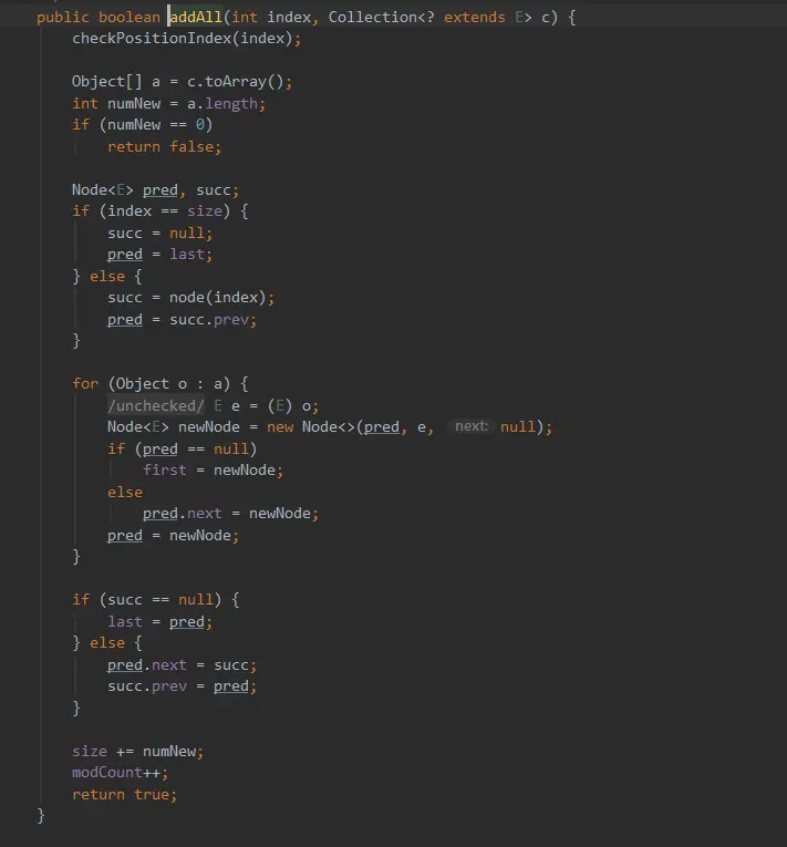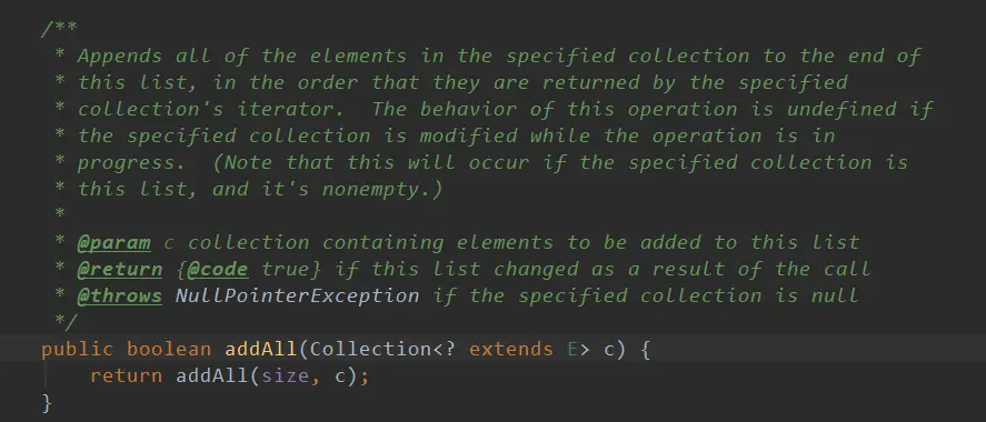 在LinkedList中有两个addAll方法一个是 addAll(Collection<? extends E> c)一个是addAll(int index, Collection<? extends E> c),其实