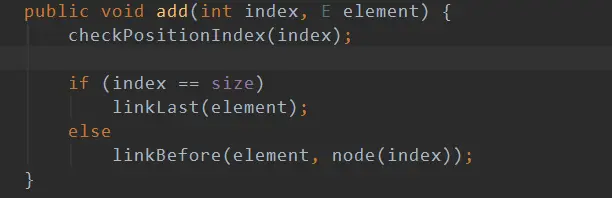然后如果索引值等于size的值则直接调用linkLast插入到尾部节点。