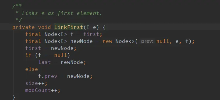 - final Node newNode = new Node<>(null, e, f);将指定元素构造成一个新节点,此节点的指向下一个节点的引用为头节点