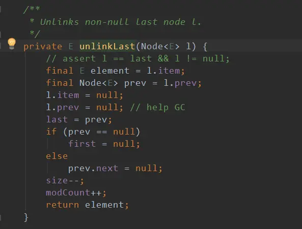 private E unlinkLast(Node<E> l) {