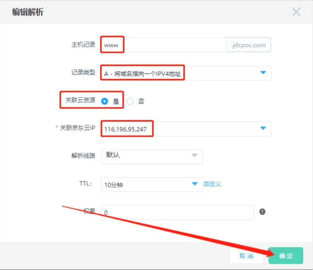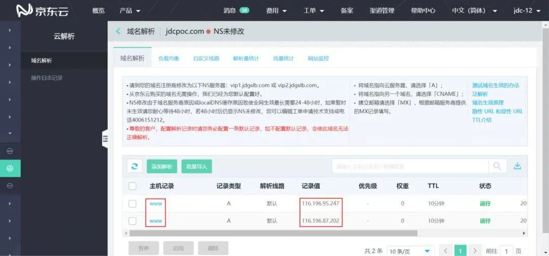 如图添加两条A记录,分别指向上一步创建的云主机dns_test1的公网IP和云主机dns_test2的公网IP(这里设置的两条记录主机记录要相同,记录值不同,具体看后面操作)