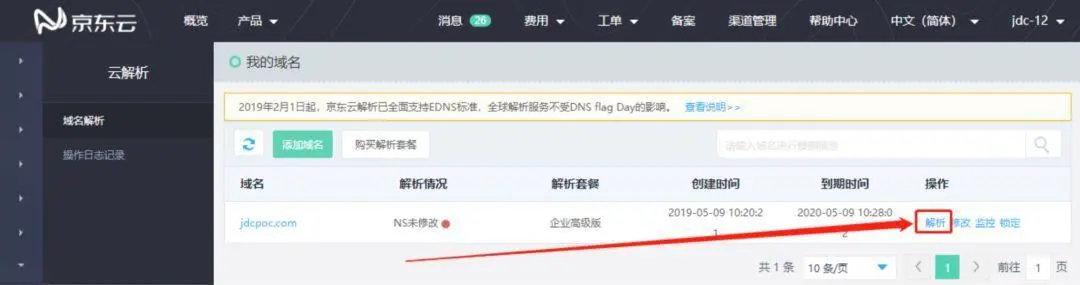 打开京东云控制台:console.jdcloud.com/,在左侧导航中依次点击域名服务-云解析,如图添加需要被解析的域名(需要填写一级域名)