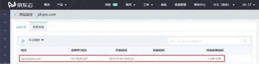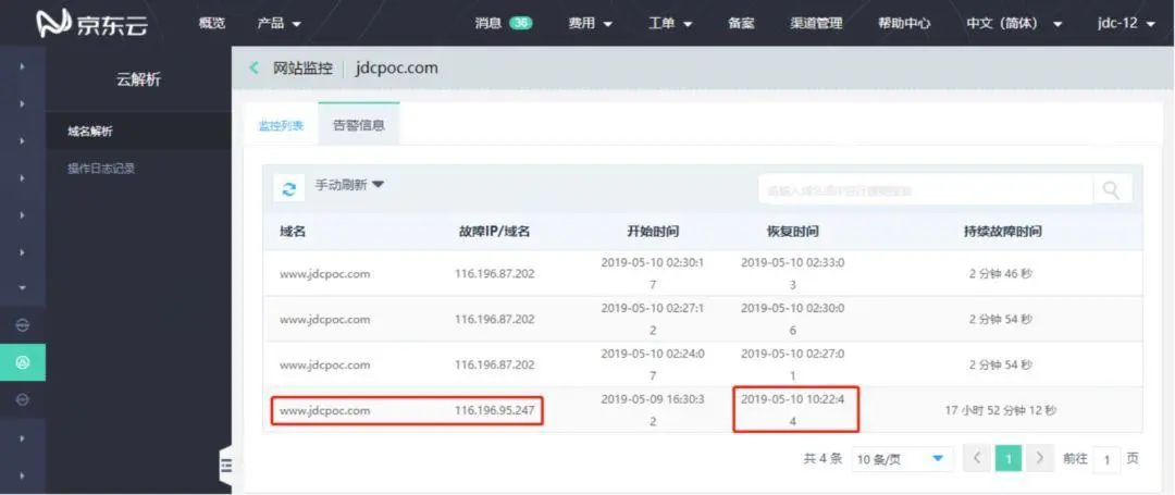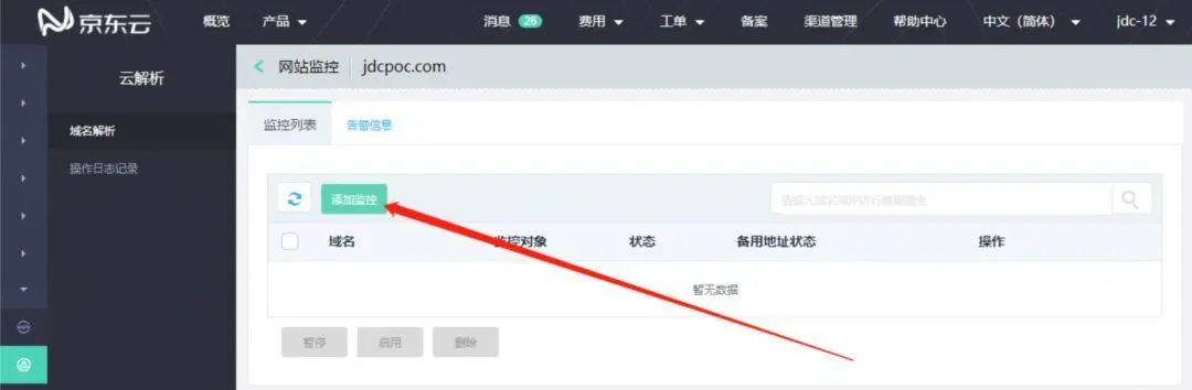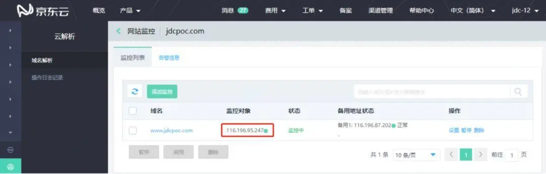 云解析是在域名解析的基础上,由京东云团队,结合京东云的优质网络、主机资源研发的高可用、高可靠、功能丰富的权威DNS服务器。云解析拥有简单易用的控制台,方便用户对域名进行操作。采用多集群、多节点部署,拥有百G防护套餐,专业DNS团队提供全面的服务保障能力。本次操作需要用到京东云云解析【企业高级版】¥3888/年,因为只有这个版本才有网站监控功能