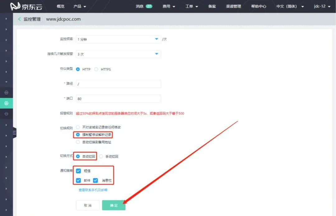 如下图,切换规则选择强制暂停该解析记录,切换方式选择自动切回,通知策略选择短信、邮件、消息栏(消息栏就是控制台顶部导航的消息)
