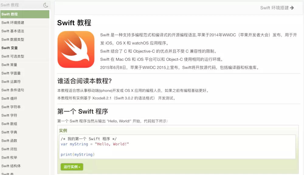 菜鸟教程:覆盖面也是非常可以的 环境 - 基本语法 - 数据类型 - 变量 - 可选项 - 常量 - 字面量 - 运算符 - 条件语句 - 循环 - 字符串 - 字符 - 数组 - 字典 - 函数 - 闭包 - 枚举 - 结构体 - 类 - 属性 - 方法 - 下标脚本 - 继承 - 构造过程 - 析构过程 - 可选链 - 自动引用计数 - 类型转换 - 拓展 - 协议 - 泛型 - 访问控制