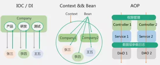 如中间图所示,所有被spring管理的、由spring创建的、用于依赖注入的对象,就叫做一个bean。Spring创建并完成依赖注入后,所有bean统一放在一个叫做context的上下文中进行管理。