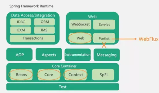 上图列出了spring框架主要包含的组件。这张图来自spring4.x的文档。目前最新的5.x版本中右面的portlet组件已经被废弃掉,同时增加了用于异步响应式处理的WebFlux组件。