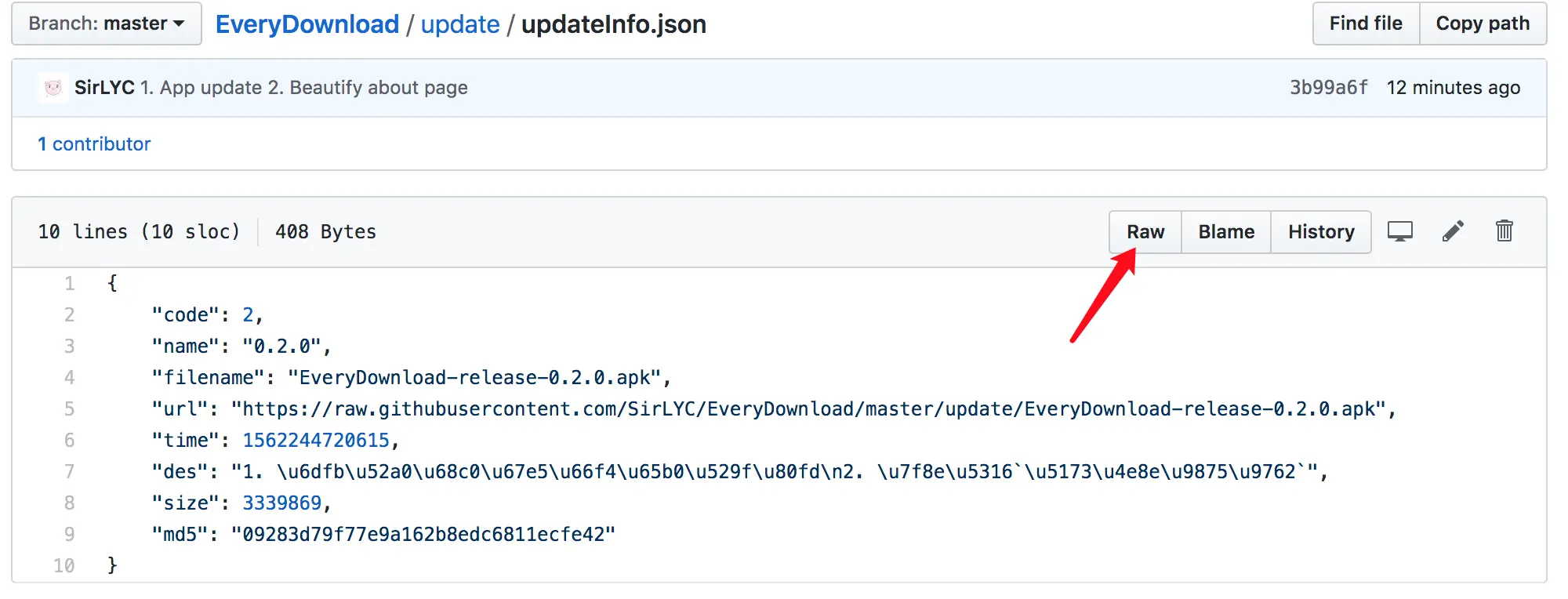 更新就相对来讲比较简单了。既然可以把GitHub作为“网盘”,我们一样可以在Git中将打包好的apk文件也commit push上去,然后找到对应路径就可以下载下来。